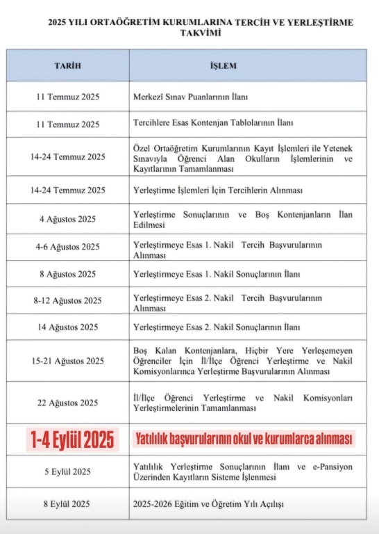 2025-2026 YILI PANSİYON TERCİH VE YERLEŞTİRME TAKVİMİ